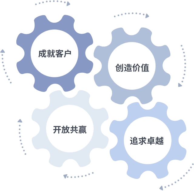 成就客户是一切决策的出发点,,,,创造价值是衡量所有工作的标准,,,,追求卓越是我们做事做人的态度,,,开放共赢是我们的格局也是最终的结果。。。价值观的齿轮环环相扣,,,,推动着组织里的每个人不断向前。。。